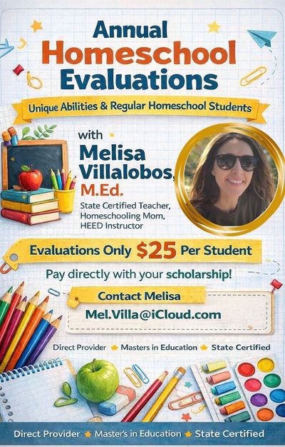 Melisa is a state certified teacher, homeschooling mom and a direct-pay Step Up provider. Contact Melisa at mel.villa@icloud.com for assistance with annual Florida homeschool evaluations.